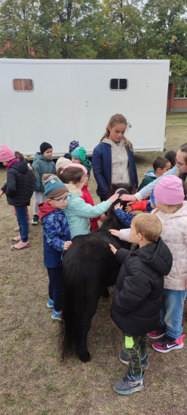Október 9-én délelőtt a Fehér család jóvoltából testközelből ismerkedhettek meg a gyermekek a pónilovakkal és a szamárral. Simogatásra, csutakolásra, lovagolásra, kocsikázásra is volt lehetőségük, amit nagyon élveztek a gyermekek.